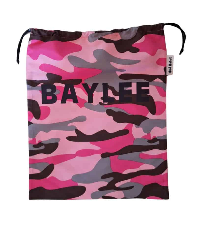 - Pink camo with navy BAYLEE – mark on fabric above the ‘EE”